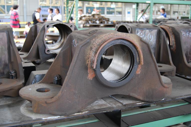 Keywords: Jikubako.JPG ja 鉄道台車の軸箱 専用の棚にパレットの上に置かれている状態で 中央に車軸と軸受(ベアリング)が入る為の穴がある(JRおおみやふれあい鉄道フェアーでの工場開放にて撮影) de Achslagerträger 投稿 が撮影 toshinori baba 2010-05-22 Rolling stock bogie parts