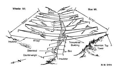 | Keywords: Jim Creek VLF antenna.png Antenna of US Navy Jum Creek VLF Radio Station near Oso Washington State USA It transmits at VLF frequencies usually around 24 kHz with an output power of 1 2 megawatts one of the most powerful radio stations in the world The main purpose of this station is to communicate one way with submerged submarines of the Pacific Fleet The antenna called a valley span antenna consists of 10 catenary cables suspended by 200 ft towers over the valley between Wheeler Mountain and Blue Mountain in a zigzag pattern Each cable is driven at the center by a short vertical cable which drops down to a transmission line bus which is comes from the transmitter building in the center It functions as a capacitively top-loaded monopole antenna; the vertical cables are the main radiating elements and the horizontal cables add capacitance to the top of the antenna to improve efficiency The antenna is divided into two sections which normally operate as one but each can operate as a separate antenna so that maintenance can be performed on one half without interrupting transmission The valley under the antenna has an extensive counterpoise ground system consisting of a network of cables suspended close to the ground http //www navy-radio com/manuals/0101-1xx/0101_113-03 pdf NAVELEX 0101 113 Naval Shore Electronics Criteria VLF LF and MF Communication Systems FSN 0280-901-1000 Naval Electronic Systems Command Dept of the Navy August 1972 p 3-15 Fig 3-9 on Nick Englund's http //www navy-radio com/index htm US Navy Radio Communications website 1972-08 US Navy Electronic Systems Command PD-USGov-Military-Navy Original upload log en wikipedia FtCG page en wikipedia Jimcreekdiagram png wikitable - 17 37 1 April 2011 628 × 350 44 969 bytes Mcg410 w en <nowiki> Diagram of Jim Creek Antenna Array NAVELEX 0101 113 Fig 3-9 August 1972 US Navy </nowiki> Antenna diagrams Wire antenna |