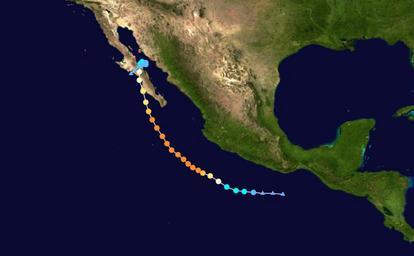 | Keywords: Jimena 2009 track.png Track map of Hurricane Jimena of the 2009 Pacific hurricane season The points show the location of the storm at 6-hour intervals The colour represents the storm's maximum sustained wind speeds as classified in the Saffir-Simpson Hurricane Scale see below and the shape of the data points represent the nature of the storm according to the legend below User Nilfanion/Tc/T Created by Cyclonebiskit using Wikipedia WikiProject Tropical cyclones/Tracks The background image is from NASA Tracking data switch source from the National Hurricane Center <sup>http //www nhc noaa gov/pastall shtml</sup> from the Central Pacific Hurricane Center <sup>http //www prh noaa gov/cphc/summaries/</sup> from the Joint Typhoon Warning Center <sup>https //metocph nmci navy mil/jtwc/best_tracks/</sup> from the Japan Meteorological Agency <sup>http //www jma go jp/jma/jma-eng/jma-center/rsmc-hp-pub-eg/besttrack html</sup> from the National Hurricane Center <sup>http //www nhc noaa gov/pastall shtml and the Central Pacific Hurricane Center http //www prh noaa gov/cphc/summaries/</sup> from the Central Pacific Hurricane Center <sup>http //www prh noaa gov/cphc/summaries/ and the Joint Typhoon Warning Center https //metocph nmci navy mil/jtwc/best_tracks/</sup> from the w National Hurricane Center <sup>http //www nhc noaa gov/pastall shtml</sup> or the Joint Typhoon Warning Center <sup>https //metocph nmci navy mil/jtwc/best_tracks/</sup> 2009-08-29 Cyclonebiskit Hurricane Jimena 2009 2009 Pacific hurricane season track maps |