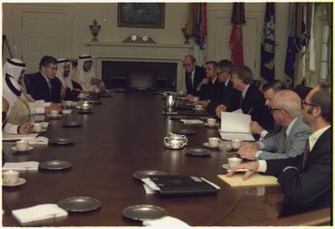 | Keywords: Jimmy Carter and Prince Fahd at a meeting between U.S. and Saudi Arabian officials. - NARA - 174853.tif Scope and content General notes 174853 Local identifier President 1977-1981 Carter White House Staff Photographers 01/20/1977 - 01/20/1981 Jimmy Carter Library NLJC 441 Freedom Parkway Atlanta GA 30307-1498 1977-05-24 Record group Collection JC-WHSP Carter White House Photographs Collection 01/20/1977 - 01/22/1981 Record group ARC 1120 Carter White House Photographs Presidential compiled 01/20/1977 - 01/22/1981 Series ARC 173341 File unit Welcome Ceremony for His Royal Highness Prince Fahd bin 'Abd al-Aziz Al-Saud Crown Prince and Deputy Prime Minister of the Kingdom of Saudi Arabia 05/24/1977 - 05/24/1977 File unit ARC 174852 Variant control numbers NAIL Control Number NLC-WHSP-C-01443-33A yes Other versions NARA-cooperation PD-USGov Relations of Saudi Arabia and the United States Fahd of Saudi Arabia Jimmy Carter with national leaders |