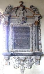 | Keywords: JoanWyndham (1669-1687) ClovellyChurch Devon.PNG en Mural monument to Joan Wyndham 1669-1687 Clovelly Church Devon She was the first wife of William Cary c 1661-1710 lord of the manor of Clovelly twice Member of Parliament for Okehampton in Devon 1685-1687 and 1689-1695 and also for Launceston in Cornwall 1695-1710 and was the daughter of Sir William Wyndham 1st Baronet c 1632-1683 of Orchard Wyndham Somerset Member of Parliament for Somerset 1656-1658 and for Taunton 1660-1679 Above are shown the arms of Cary Argent on a bend sable three roses of the field impaling Wyndham Azure a chevron between three lion's heads erased or which arms on escutcheons are also held by a pair of putti below Inscribed as follows In memory of Joan the wife of William Cary of Clovelly Esq<sup>r</sup> daughter of S<sup>r</sup> William Wyndham of Orchard Wyndham in the county of Somersett Baronett who dyed Febr<sup>y</sup> the 4<sup>th</sup> 86/7 in the 18<sup>th</sup> year of her age and lys buryed in St Decomans Church Somersett En forma moribus virtutibus vere egregiam Sed cum egregiam dicimus hic tacemus lugentes i e Behold in her appearance morals and virtues she was truly outstanding But when we say outstanding here we are silent lamenting own photo Lobsterthermidor <span class signature-talk ></span> 15 04 13 February 2015 UTC 2014 All Saints Church Clovelly interior Wall mounted church monuments in Devon Cary arms Wyndham arms |