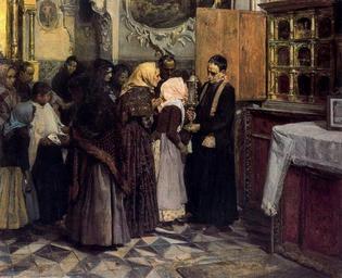| Keywords: Joaquín Sorolla y Bastida - La Reliquia.jpg Artwork Creator Joaquín Sorolla 1893 oil on canvas cm 103 5 125 5 Institution Bilbao Fine Arts Museum place of discovery object history exhibition history credit line accession number place of creation http //www foroxerbar com/viewtopic php t 3993 PD-old-auto-1923 1923 Paintings of people from Spain by Joaquín Sorolla Paintings in the Bilbao Fine Arts Museum Paintings by Joaquín Sorolla in the Bilbao Fine Arts Museum Christian relics in art Kisses in paintings People kissing objects Paintings of priests Genre paintings with religious titles Group portrait paintings 1893 oil on canvas paintings 1893 paintings in Spain |