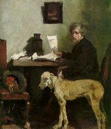 | Keywords: Johann Ernst Sattler (1840-1923) Self-portrait.jpg Artwork creator Wilhelm Leibl Der Maler Sattler mit Dogge The Painter Sattler with dogge 1870/71 Oil canvas cm 71 7 62 2 Institution Neue Pinakothek 8579 http //www pinakothek de/wilhelm-leibl/der-maler-sattler-mit-dogge Bayerische Staatsgemäldesammlungen http //www pinakothek de/sites/default/files/imagecache/thumb_lightbox_light/gemaelde/original/3007_989 jpg image Object history 1910 aus dem Besitz von Wilhelm Trübner erworben http //portraitsofpainters blogspot com/2009/01/ernst-sattler html Other versions <gallery> File Jahrhundertausstellung 1906 KatNr 0985 jpg Wilhelm Leibl Bildnis des Malers Sattler mit Dogge File Wilhelm Maria Hubertus Leibl 026 jpg </gallery> PD-old-100-1923 DEFAULTSORT Leibl Wilhelm; Portrait male Sattle; Neue Pinakothek Paintings by Wilhelm Leibl German paintings in the Neue Pinakothek Johann Ernst Sattler Portrait paintings of painters 19th-century portrait paintings location missing 19th-century portrait paintings not categorised by year 19th-century oil portraits of sitting men at full length 19th-century portrait paintings in interiors 19th-century portrait paintings with dogs Portrait paintings of men with dogs |