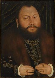 | Keywords: Johann Friedrichs des Großmütigen, Kurfürst von Sachsen 1551 (DE SWK 6549).jpg en Portrait of Johann Friedrich the Magnanimous Elector of Saxony The narrow pictorial space and the closeness of the green curtain with the acidic yellow raking light doesn't leave him Johann Friedrich much scope The embroidery on the doublet the summary execution of the brown fur the gold chains and the numerous rings illustrate his royal class his gaze seeks allies and loyal subjects On this portrait the disfiguring scar on his face was considered disturbing and overpainted but it is still visible after 1551 http //lucascranach org/DE_SWK_6549 Lucas Cranach the Younger other versions PD-100 Images uploaded by Fæ Portrait paintings by Lucas Cranach the Younger Male fur clothing in art Paintings by Lucas Cranach the Younger with fur Fur fashion in 1552 Fur clothing of native people of Germany |