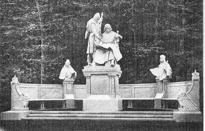 | Keywords: Johann Otto Siegesallee.JPG Ehemalige Siegesallee in Berlin mit dem Doppelstandbild fĂĽr die gemeinsam regierenden Brandenburger Markgrafen Johann I 1213 “1266 und Otto III ca 1215 “1267 Söhne von Albrecht II Die Nebenfigur BĂĽste links zeigt den Propst Simeon von Cölln die Figur rechts Marsilius erster nachgewiesener Schulze SchultheiĂź und Richter von Berlin Bildhauer Max Baumbach EnthĂĽllung 22 März 1900 Der auf einem Stein sitzende Johann I hat ĂĽber seinen Knien die Urkunde ausgebreitet durch die Berlin und Cölln das Stadtrecht erhalten haben sollen Der jĂĽngere Otto III steht neben ihm und weist mit einem Arm auf die Urkunde während der andere Arm auf einem JagdspieĂź ruht Die jugendlichen StädtegrĂĽnder sind hier als reife Männer dargestellt denn zwei Knabengestalten hätten den GrĂĽndungsakt einer späteren Weltstadt aus Sicht der gängigen Geschichtsinterpretation nicht angemessen zum Ausdruck bringen können The former Siegesallee in Berlin with the double statue commemorating the corulers of Brandenburg Margrave John I 1213 “1266 and Margrave Otto III ca 1215 “1267 sons of Albert II and grandchildren of Otto II The bust on the left commemorates Provost Simeon of Cölln that on the right Marsilius de Berlin the first documented Schulze mayor and judge of Berlin Sculptor Max Baumbach The sculpture was unveiled on 22 March 1900 Spread across the knees of John I is the document granting town charters to Berlin and Cölln The younger Otto III stands beside him pointing to the charter with one arm while the other rests on a hunting spike The youthful city founders are portrayed here as mature men because in the view of contemporaries the significance of founding the later metropolis would not have been adequately manifested as an act of two youngsters Jan von Flocken Die Siegesallee Auf den Spuren der brandenburgisch-preuĂźischen Geschichte Kai Homilius Verlag Berlin 2001 ISBN 3-89706-899-0 page 88 and 1899 1900 Max Baumbach and Karl Begas sculptors Siegesallee 05 Johann I + Otto III PD-old |