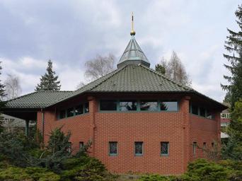Keywords: Johann-Sebastian-Bach-Kirche.JPG de Blick auf die Kirche von der Straße aus own Bodo Kubrak 2013-04-08 Johann-Sebastian-Bach-Kirche Berlin-Lichterfelde Cc-zero