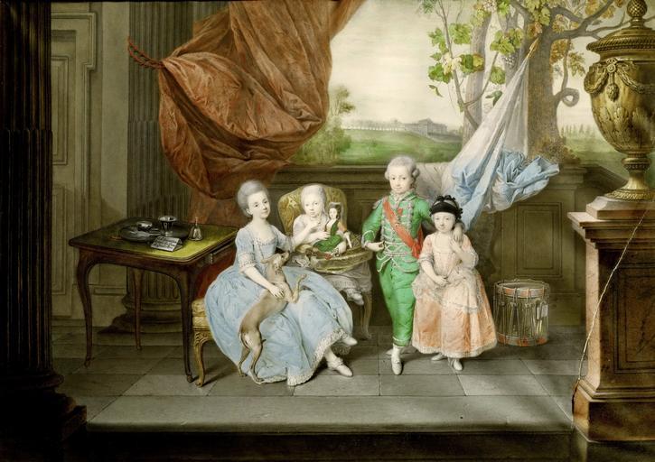 | Keywords: Johann Zoffany 008.jpg The children of Ferdinand of Parma Louis Carolina Maria Antonia and Carlotta Prinz Ludwig von Parma 1773-1803 mit seinen drei ältesten Geschwistern Karoline 1770-1804 Marie Antonia 1774-1841 und Charlotte 1777-1813 1778 oil canvas 159 x 184 5 cm Rahmenmaße 169 5 x 194 x 7 cm Museum Kunsthistorisches Museum Inv -Nr GG_2579 http //bilddatenbank khm at/viewArtefact id 2534 Provenienz Für Kaiserin Maria Theresia gemalt; 1781 in der Galerie nachweisbar;<br/> Abgebildete Personen Carlotta di Ferdinando I di Bourbon Parma<br/> Carolina Maria Teresa di Ferdinando I di Bourbon Parma<br/> Maria Antonietta di Ferdinando I di Bourbon Parma<br/> Luigi Francesco di Ferdinando I di Bourbon Parma other versions PD-old-100 original upload log wikitable date/time username resolution size edit summary ---- 20 30 4 September 2008 User Cropbot <a href http //upload wikimedia org/wikipedia/commons/0/02/Johann_Zoffani_005 jpg ><img alt Thumbnail for version as of 20 30 4 September 2008 src http //upload wikimedia org/wikipedia/commons/thumb/0/02/Johann_Zoffani_005 jpg/120px-Johann_Zoffani_005 jpg width 120 height 102 border 0 /></a></td><td>458×390 29 KB <nowiki>upload cropped version operated by <a href /wiki/User Finavon title User Finavon >User Finavon</a> Summary border cropped</nowiki> ---- 11 13 2 September 2008 User Gryffindor <a href http //upload wikimedia org/wikipedia/commons/archive/0/02/20080904203028 21Johann_Zoffani_005 jpg ><img alt Thumbnail for version as of 11 13 2 September 2008 src http //upload wikimedia org/wikipedia/commons/thumb/archive/0/02/20080904203028 21Johann_Zoffani_005 jpg/120px-Johann_Zoffani_005 jpg width 120 height 99 border 0 /></a></td><td>500×414 35 KB <nowiki> remove border Prinz Ludwig von Parma 1773-1803 mit seinen drei ältesten Geschwistern Karoline 1770-1804 Marie Antonie 1774-1841 und Charlotte 1777-1813 Inv -Nr GG_2579 Provenienz Für Kaiserin Maria Theresia gema</nowiki> DEFAULTSORT 1778; Bourbon-Parma Portrait paintings by Johann Zoffany Paintings by Johann Zoffany in the Kunsthistorisches Museum Louis of Etruria Princess Carolina of Parma Princess Maria Antonia of Parma 1778 portrait paintings 18th-century family portraits of royalty 18th-century oil portraits of children at full length 18th-century people of Italy 18th-century portrait paintings in the Kunsthistorisches Museum Chairs in portraits Drapery in portrait paintings Drums in art Group paintings of children Group portraits with 4 persons Family portraits of Italian rulers Portraits of girls with dolls Portraits of siblings Portrait paintings of children with dogs Portraits in palace loggia Sashes of chivalric orders in portrait paintings Young siblings in art 1770s portrait paintings Carlota Maria of Parma Pudding caps ImageNote 1 1305 1077 286 795 3637 2567 2 Princess Carolina ImageNoteEnd 1 ImageNote 2 2119 850 241 518 3637 2567 2 Prince Luigi Prince of Piacenza future King Louis I of Etruria ImageNoteEnd 2 ImageNote 3 2410 1140 168 700 3637 2567 2 Princess Maria Antonia ImageNoteEnd 3 ImageNote 4 1696 995 173 445 3637 2567 2 Princess Calotta Maria ImageNoteEnd 4 |