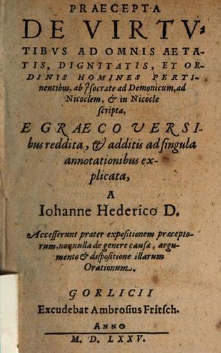 | Keywords: Johannes Hedericius (1542-1617).jpg en Johannes Heidenreich 1542-1617 The rules of Virtue Praecepta de virtutibus 1575 pt Johannes Heidenreich 1542-1617 As regras da virtude Praecepta de virtutibus 1575 Google books Johannes Heidenreich 1542-1617 1575 PD-old-100 1575 books Title pages in Latin |