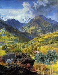 Keywords: john brett painting art oil on canvas landscape mountains ravine valley forest trees woods fall autumn goat nature outside barn farm