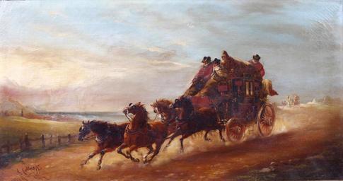 | Keywords: John Charles Maggs - The Mail Coach.jpg 1884 oil canvas cm 34 65 object history credit line signed and dated 1892 lower left accession number http //www bonhams com/auctions/18174/lot/227/ Bonhams PD-old-100 John Charles Maggs Coaches in art 1884 paintings Images from Bonhams |