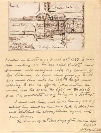| Keywords: John Constable - A Recollection of the New R.A. - Google Art Project.jpg Inscribed in artist's hand in pen and brown ink upper left ; in artist's hand in pen and brown ink upper center Ca h ; in artist's hand in pen and brown ink upper right St Martin's Workhouse St Math Lane court Wuler in artist's hand in pen and brown ink center left N Gallery ; in artist's hand in pen and brown ink center Hall of N Gallery Hall of Beauty in artist's hand in pen and brown ink center right A Room School of Painting Room architecture ; in artist's hand in pen and brown ink lower left Pall Mall East A Recollection of the New RA 28 March 1837 John Constable ; in artist's hand in pen and brown ink lower center Trafalgar Square Pap ; in artist's hand in pen and brown ink lower right St Matws Church Inscribed on mount in pen and brown ink I called on Constable on March 28th 1837 He was there working on his 'Arundel Castle ' and seemed well satisfied with the results - of his labours He said while giving a touch here and therre with his Palette knife and retiring to see the effect 'it is neither too warm nor too cold Too light nor too dark and this constitutes every thing in a Picture ' I dined with him and in the Evening on my asking him about the then new R A he took a pen and sketched the above plan signed and gave it me He died on the 31st three days after see the life page 113 A T Dec 8th 1888 ; inscribed on back of mount lower right in graphite M 50 22 x 16 Mount open with letter plain blue over mount Inscription _Signed_and_Dated Signed in artist's hand in pen and brown ink lower right 28 March 1837 John Constable Not on View Pen and brown ink on medium smooth cream wove paper sketch genre subject map special url_id 7wEBqb_QcWSA5Q PD-old-100-1923 1837 John Constable Google Art Project works by John Constable Drawings by John Constable |