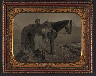 | Keywords: library of congress libraryofcongress dc:identifier=http://hdl.loc.gov/loc.pnp/ppmsca.27549 dc:identifier=httphdllocgovlocpnpppmsca27549 xmlns:dc=http://purl.org/dc/elements/1.1/ xmlns:dc=httppurlorgdcelements11 u.s. civil war uscivilwar american civil war americancivilwar the civil war thecivilwar civil war civilwar war between the states warbetweenthestates united states of america unitedstatesofamerica u.s.a. usa the union theunion union the north thenorth yankee yankees soldier officer john e. cummins johnecummins john cummins johncummins cummins horse picture frame photo border [John E. Cummins of the 50th, 99th, and 185th Ohio Infantry regiments in Union uniform next to a horse] [between 1861 and 1865] 1 photograph : quarter-plate tintype, hand-colored ; 12.1 x 15.2 cm (case) Notes: Title devised by Library staff. Case: Leather grapes in vase with scroll embellishments. Cummins served as a Colonel, Lt. Colonel, and Brevet Brigadier General while with the 99th, 50th, and 185th Ohio Infantry Photo shows John E. Cummins, who enlisted at the age of 31 as a Lt. Colonel in the 99th Ohio Infantry. In December 1864 he was transferred to the 50th Ohio, and was then promoted to the rank of Colonel and transferred to the 185th Ohio in February 1865. In November 1865 Cummins was promoted to Brevet Brigadier General. He died in 1875 in Denver, Colorado. (Source: Matthew R. Gross and Elizabeth T. Lewin, 2010) Gift; Tom Liljenquist; 2010; (DLC/PP-2010:105). Published in: Horse equipment of the Civil War era. Fairfax, Virginia: SCS Publications, 2003, back cover. Subjects: Cummins, John E.,--1831-1875. United States.--Army.--Ohio Infantry Regiment, 99th (1862-1864)--People. United States.--Army.--Ohio Infantry Regiment, 50th (1862-1865)--People. United States.--Army.--Ohio Infantry Regiment, 185th (1865)--People. Soldiers--Union--1860-1870. Military uniforms--Union--1860-1870. Horses--1860-1870. United States--History--Civil War, 1861-1865--Military personnel--Union. United States--History--Civil War, 1861-1865--Animals--Union. Format: Portrait photographs--1860-1870. Tintypes--Hand-colored--1860-1870. Rights Info: No known restrictions on publication. Repository: Library of Congress, Prints and Photographs Division, Washington, D.C. 20540 USA, hdl.loc.gov/loc.pnp/pp.print Part Of: Ambrotype/Tintype filing series (Library of Congress) (DLC) 2010650518 Liljenquist Family collection (Library of Congress) (DLC) 2010650519 More information about this collection is available at hdl.loc.gov/loc.pnp/pp.lilj Persistent URL: hdl.loc.gov/loc.pnp/ppmsca.27549 Call Number: AMB/TIN no. 5043 [John E. Cummins of the 50th, 99th, and 185th Ohio Infantry regiments in Union uniform next to a horse] [between 1861 and 1865] 1 photograph : quarter-plate tintype, hand-colored ; 12.1 x 15.2 cm (case) Notes: Title devised by Library staff. Case: Leather grapes in vase with scroll embellishments. Cummins served as a Colonel, Lt. Colonel, and Brevet Brigadier General while with the 99th, 50th, and 185th Ohio Infantry Photo shows John E. Cummins, who enlisted at the age of 31 as a Lt. Colonel in the 99th Ohio Infantry. In December 1864 he was transferred to the 50th Ohio, and was then promoted to the rank of Colonel and transferred to the 185th Ohio in February 1865. In November 1865 Cummins was promoted to Brevet Brigadier General. He died in 1875 in Denver, Colorado. (Source: Matthew R. Gross and Elizabeth T. Lewin, 2010) Gift; Tom Liljenquist; 2010; (DLC/PP-2010:105). Published in: Horse equipment of the Civil War era. Fairfax, Virginia: SCS Publications, 2003, back cover. Subjects: Cummins, John E.,--1831-1875. United States.--Army.--Ohio Infantry Regiment, 99th (1862-1864)--People. United States.--Army.--Ohio Infantry Regiment, 50th (1862-1865)--People. United States.--Army.--Ohio Infantry Regiment, 185th (1865)--People. Soldiers--Union--1860-1870. Military uniforms--Union--1860-1870. Horses--1860-1870. United States--History--Civil War, 1861-1865--Military personnel--Union. United States--History--Civil War, 1861-1865--Animals--Union. Format: Portrait photographs--1860-1870. Tintypes--Hand-colored--1860-1870. Rights Info: No known restrictions on publication. Repository: Library of Congress, Prints and Photographs Division, Washington, D.C. 20540 USA, hdl.loc.gov/loc.pnp/pp.print Part Of: Ambrotype/Tintype filing series (Library of Congress) (DLC) 2010650518 Liljenquist Family collection (Library of Congress) (DLC) 2010650519 More information about this collection is available at hdl.loc.gov/loc.pnp/pp.lilj Persistent URL: hdl.loc.gov/loc.pnp/ppmsca.27549 Call Number: AMB/TIN no. 5043 |