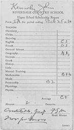 | Keywords: John F. Kennedy Riverdale Country School Report Card February 25, 1930 - NARA - 192826.tif Scope and content General notes 192826 Local identifier Kennedy John F John Fitzgerald 1917-1963 John F Kennedy Library NLJFK Columbia Point Boston MA 02125-3398 1930-02-25 Record group Collection JFK-JFKPP John F Kennedy Personal Papers 1917 - 1963 Record group ARC 1158 John F Kennedy Personal Papers Early Years compiled 1929 - 1940 Series ARC 192822 File unit John F Kennedy Personal Papers Early Years Correspondence 1929 - 1935 1929 - 1935 File unit ARC 192823 Variant control numbers NAIL Control Number NLK-JFKPP-ERLYYRS-COR1929TO1935-JFKRPTCRD022530 yes Other versions NARA-cooperation PD-USGov Documents related to John F Kennedy 1930 in the United States Riverdale Bronx School certificates |