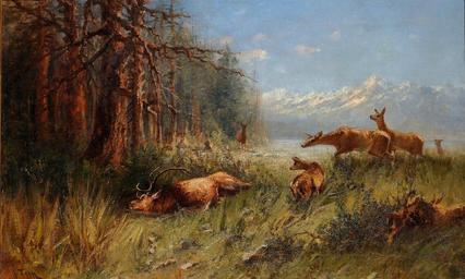 Keywords: John Fery-Landscape with Fallow Deers.jpg Artwork title Landscape with Fallow Deers Landskap med dovhjortar John Fery USA 1859-1934 oil canvas cm 36 56 www uppsalaauktion se Public domain Other versions John Fery Deer in art PD-Art
