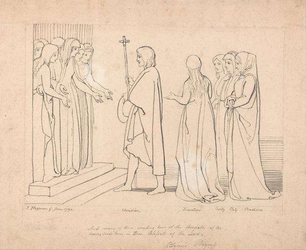 | Keywords: John Flaxman - Illustration to Pilgrim's Progress - Google Art Project.jpg <nowiki>Inscribed in gray ink lower center Christian Discretion Charity Piety Prudence ; in gray ink lower center And many of them meeting turn at the threshold of the house said Come in Thou Blessed of the Lord; Pilgrim's Progress </nowiki> Inscription _Signed_and_Dated Signed and dated in gray ink lower left J Flaxman 8 June 1792 Not on view Black ink on medium slightly textured cream wove paper women crosses motifs men ceremonies procession steps robes historical subject special url_id JQF8IBNPOY48-w PD-old-100-1923 1826 John Flaxman Google Art Project works by John Flaxman Pilgrim's Progress |