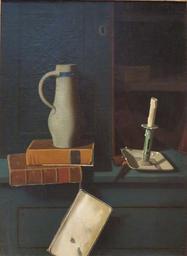 | Keywords: John Frederick Peto - 'Jug, Books, and Candle', c. 1890, High Museum.JPG John Frederick Peto - Jug Books and Candle oil on canvas c 1890 High Museum of Art own 1890 Creator John Frederick Peto John Frederick Peto American still-life paintings in the High Museum of Art Peto Trompe l'oeil still life paintings PD-old-100 |