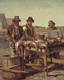 | Keywords: John George Brown - Cleaning fish.jpg Artwork Creator John George Brown 1877 oil canvas in 24 5 19 5 Private collection accession number object history credit line exhibition history J G Brown N A / 1877 ~ lower right signature / date 1 source <br/>2 http //montgomerygallery com/art/artwork asp key 832 Montgomery Gallery San Francisco PD-old-auto-1923 1913 John George Brown 19th-century paintings of seaworkers and fishermen Cleaning fish Fish processing in the United States Fish in art Fishermen's clothing |