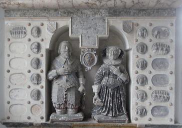 | Keywords: John&MaryFortescueWeareGiffard.jpg en Figures of John Fortescue and his wife Mary Speccot Fortescue mural monument Weare Giffard Church Devon own photo own photo 1638; photo Apr 2012 Holy Trinity church Weare Giffard Wall mounted church monuments in Devon |