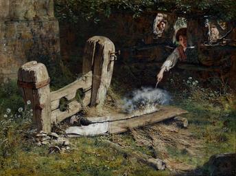 | Keywords: John Ritchie An Expected Rise in Stocks.jpg An Expected Rise in Stocks Signed with initials 'J R' Oil on canvas 35 5 x 45 5 cm An Expected Rise in Stocks Das Gemälde zeigt Kinder die als Streich einen Dorfpranger mit Schwarzpulver in die Luft sprengen Es ist die Bebilderung eines englischen Wortspiels Der Titel wird zunächst als Ein erwarteter Anstieg der Aktien verstanden kann wörtlich aber auch gedeutet werden als Ein erwartetes Hochgehen eines Stocks Fußblocks Dorfprangers Öl auf Leinwand 35 5 x 45 cm http //www bonhams com/ Bonhams century 19 John Ritchie fl 1858-1875 PD-old Images from Bonhams Stocks restraints Puns Mischievous children in art Gunpowder John Ritchie |