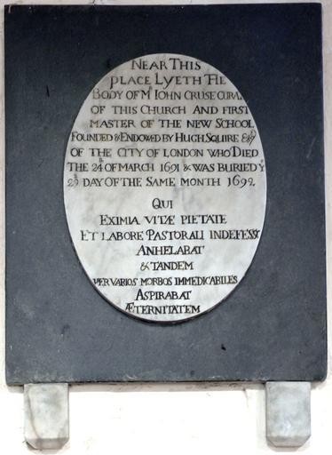 | Keywords: JohnCruse Died 1692 SouthMoltonChurch Devon.PNG en Mural monument on north aisle wall of St Mary Magdalen's Church South Molton Devon to John Cruse d 1692 new style the first Master of the Free School founded in 1682 by Hugh Squier 1625-1710 in East Street South Molton Inscribed as follows Near this place lyeth the body of M aste r John Cruse curat e of this church and first Master of the new school founded endowed by Hugh Squire sic Esq of the City of London who died the 24th of March 1691 and was buried ye 29th day of the same month 1692 Qui eximia vitae pietate et labore pastorali indefesse anhelabat tandem per varios morbos immedicabiles aspirabat aeternitatem Who having been unwearied by distinguished piety and labour of a pastoral life was panting for and at last through various incurable diseases breathed-in Eternity own photo Lobsterthermidor <span class signature-talk ></span> 19 40 7 September 2015 UTC 2015 South Molton Wall mounted church monuments in Devon |