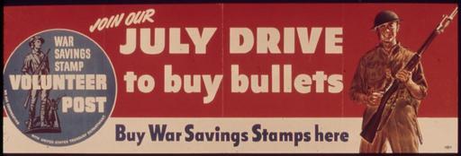 | Keywords: "Join Our July Drive to Buy Bullets. Buy War Savings Stamps Here" - NARA - 514732.jpg Scope and content General notes 514732 Local identifier 44-PA-1146 Office for Emergency Management Office of War Information Domestic Operations Branch Bureau of Special Services 03/09/1943 - 09/15/1945 Still Picture Records Section Special Media Archives Services Division NWCS-S National Archives at College Park 8601 Adelphi Road College Park MD 20740-6001 1941 - 1945 Record group Record Group 44 Records of the Office of Government Reports 1932 - 1947 Record group ARC 373 World War II Posters compiled 1942 - 1945 Series ARC 513498 File unit File unit ARC Variant control numbers NAIL Control Number NWDNS-44-PA-1146 Other versions <gallery> File Join_Our_July_Drive_to_Buy_Bullets _Buy_War_Savings_Stamps_Here _-_NARA_-_514732 tif tif File Join_Our_July_Drive_to_Buy_Bullets _Buy_War_Savings_Stamps_Here _-_NARA_-_514732 jpg jpg </gallery> NARA-cooperation PD-USGov World War II war stamps posters from the United States |
