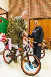 | Keywords: Joint Base volunteers, police and Toys for Tots help disadvantaged youth 131218-N-WY366-008.jpg en Marine Sgt Ryan Stitzel of Fleetwood Pa assigned to Marine Barracks Washington gives way a bike and a smile to a boy from the District of Columbia's Ward 8 as part of the Marine's annual Toys for Tots program Military and civilian personnel and their families living or working at Joint Base Anacostia-Bolling JBAB volunteered and helped make the Christmas holiday season more joyful for nearly 300 youth in Ward 8 at a Disadvantaged Youth Holiday Party sponsored by the Metropolitan Police Department ™s Seventh District on Dec 18 The JBAB volunteers helped serve food to the children; pass out gifts and help with the distribution of 80 bicycles donated to the Marine Corps Foundation ™s Toys for Tots program for the neediest of the children The JBAB-based U S Air Force Rock Band Max Impact kicked the event off with energetic holiday music that quickly had children on their feet and dancing Santa and Mrs Claus arrived at the event by police helicopter where they were met by Rudolph the Red-nosed Reindeer and Frosty the Snowman D C Mayor Vincent Gray stopped by to visit with the children and wish them a Merry Christmas 2013-12-18 Lt Cmdr Jim Remington https //www dvidshub net/image/1142703 131218-N-WY366-008 2013-12-20 19 14 WASHINGTON DC US PD-USGov-Military-Navy Marine Barracks Washington D C Joint Base Anacostia-Bolling Images from DoD uploaded by Fæ |