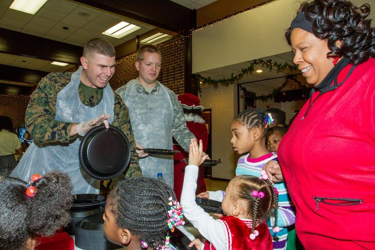 | Keywords: Joint base volunteers, police and Toys for Tots help disadvantaged youth 131218-N-WY366-004.jpg en Marine Sgt Ryan Stitzel of Fleetwood Pa assigned to the Marine Barracks Washington exchanges smiles with a child as he serves her up a delicious warm lunch Military and civilian personnel and their families living or working at Joint Base Anacostia-Bolling JBAB volunteered and helped make the Christmas holiday season more joyful for nearly 300 youth in the District of Columbia ™s Ward 8 at a Disadvantaged Youth Holiday Party sponsored by the Metropolitan Police Department ™s Seventh District on Dec 18 The JBAB volunteers helped serve food to the children pass out gifts and help with the distribution of 80 bicycles donated to the Marine Corps Foundation ™s Toys for Tots program for the neediest of the children The JBAB-based U S Air Force rock band Max Impact kicked the event off with energetic holiday music that quickly had children on their feet and dancing Santa and Mrs Claus arrived at the event by police helicopter where they were met by Rudolph the Red-nosed Reindeer and Frosty the Snowman D C Mayor Vincent Gray stopped by to visit with the children and wish them a merry Christmas 2013-12-18 Lt Cmdr Jim Remington https //www dvidshub net/image/1142699 131218-N-WY366-004 2013-12-20 19 14 WASHINGTON DC US PD-USGov-Military-Navy Marine Barracks Washington D C Joint Base Anacostia-Bolling Images from DoD uploaded by Fæ |