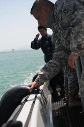 | Keywords: Joint small boat operations 110711-N-MN220-076.jpg en Spc Ronnie Escoto front a soldier assigned to the Joint Task Force Guantanamo Visitors Bureau attaches a bumper to the side of a Navy small boat while transiting the bay July 11 Escoto works with sailors from the Naval Station Port Operations department in support of Joint Task Force missions 2011-07-11 Petty Officer 2nd Class Joseph Ebalo https //www dvidshub net/image/426793 110711-N-MN220-076 2011-07-12 18 07 CU PD-USGov-Military-Navy Joint Task Force Guantanamo Images from DoD uploaded by Fæ |