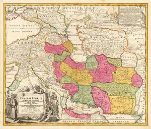 | Keywords: Jomann Imperium Periscum.jpg en Map of Persia<br/> Copperplate print on paper colorized 53 × 60 7 cm<br/> Detailed map of the Persian empire extending from the Black Sea Khasikstan and Turkistan in the North to the Red Sea Persian Gulf Euphrates and the Mediterranean in the South showing a part of Cyprus Decorative map showing cities mountains rivers lakes roads etc Large decorative cartouche inthe lower left corner and smaller cartouche in the right upper corner http //www lot-tissimo net/ www lot-tissimo net - other date ca 1700 ca 1720 Creator Johann Baptist Homann Image extracted File Johann Baptist Homann Imperii Persici In Omnes Suas Provincias Caucasus JPG File Johann Baptist Homann Imperii Persici In Omnes Suas Provincias Circassia JPG File Johann Baptist Homann Imperii Persici In Omnes Suas Provincias Middle East JPG PD-old-100 Maps of the history of Iran Johann Baptist Homann Safavid Empire Maps Old maps of the Caucasus Old maps of Turkey Old maps of the Middle East Old maps of Iraq Old maps of Iran Old maps of Uzbekistan Maps made in the 18th century Old maps showing the whole Near East 18th-century maps of Armenia 18th-century maps of Azerbaijan Old maps of Shirvan |