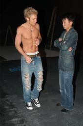 Keywords: Jonny Blu Dao Feng Video.JPG en Behind the scenes photo of Jonny Blu and the Director of his first music video in Hong Kong own Toylab 2003-12-02 Hong kong pop Chinese pop music Jonny Blu Topless standing men