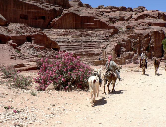 Keywords: jordan petra amphitheater roman ruins civilization archaeology path donkeys pink sandstone