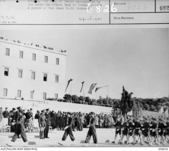 | Keywords: JorgeIIDeGreciaYDEsfileDeEON25031941--006826.jpeg ATHENS THE KING OF GREECE ACCOMPANIED BY HIS UNCLE THE PRINCE PAUL OF CRETE REVIEWS A PARADE OF THE GREEK YOUTH MOVEMENT es Desfile de la Organización de la Juventud Griega EON en Atenas ante el rey Jorge II en abril de 1941 This image was sourced from the Australian War Memorial Collection 006821 Database http //cas awm gov au/item/006826 1941-03-25 D Parer PD-Australia Athens in World War II 1941 in Athens George II of Greece Paul I of Greece Independence Day Greece Black and white photographs National Youth Organisation Events at the Syntagma Square March 1941 in Greece 25 |