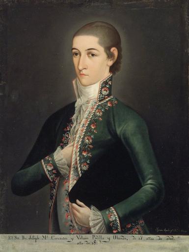 | Keywords: Jose Maria Cervantes y Velasco.jpg Jose Maria Cervantes y Velasco es in 1802 at the age of 17 es El Sor Dn Joseph Ma Cervantes y Velasco Padilla y Obando de 17 años de edad año de 1802 1802 Oil on canvas Institution Brooklyn Museum http //www brooklynmuseum org/opencollection/objects/1087/Don_Jos C3 A9_Mar C3 ADa_ G C3 B3mez_de _Cervantes_y_Altamirano_de_Velasco Brooklyn Museum PD-old-100 <gallery>Brooklyn Museum - Don José María Gómez de Cervantes y Altamirano de Velasco - Ignacio Ayala - overall jpg</gallery> DEFAULTSORT Cervantes y Velasco Jose Maria Ignacio Ayala 19th-century portrait paintings in the Brooklyn Museum 1802 1802 oil on canvas paintings in the United States Portrait 1802 portrait paintings Male 19th-century oil portraits of standing men at half length 1802 19th-century portrait paintings from Mexico 1802 Green clothing in art male 1802 Hand-in-waistcoat in portrait paintings 1802 Mexican War of Independence Mexico in the 1800s People of the history of Mexico Portrait paintings of men holding tricorne hats 1802 Three-quarter view portrait paintings of men facing left Ayala |