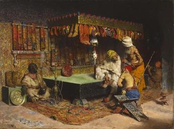 | Keywords: José Villegas Cordero - The Slipper Merchant - Walters 37105.jpg In the dimly lit richly colored interior of a North African shop a turbaned merchant serves a customer seated on a divan Kneeling in front is an attendant and barely discernible in the background is a craftsman at work To the left a man smokes a hookah Villegas has adopted a subject made popular by Mariano Fortuny but rather than exploring light effects he provides an almost overwhelmingly detailed array of bric-a-brac Even the picture frame custom-ordered for this painting is inscribed in Naskh script There is no God but Allah and Mohammed is his Prophet 1872 Oil on canvas cm 48 3 65 ; Framed H without build-up 36 1/4 x W 42 1/2 x D 4 1/4 in 92 08 x 107 95 x 10 8 cm accession number 37 105 34525 William T Blodgett Sale New York 1876 no 60 J Pierpont Morgan ca 1879 by purchase William T Walters Baltimore date and mode of acquisition unknown Henry Walters city Baltimore Walters Art Museum Henry Walters Acquired by William T Walters Signature Lower left Villegas; Date Lower left 1872 L'Orientalisme de Delacroix a Kandinsky Musees royaux des Beaux-Arts de Belgique Brussels; Kunsthalle der Hypo-Kulturstiftung Munich; Musée des Beaux-Arts Marseille Marseille 2010-2011 place of origin Venice Italy PD-old-auto 1921 José Villegas Cordero Media contributed by the Walters Art Museum needs category review Paintings in the Walters Art Museum |