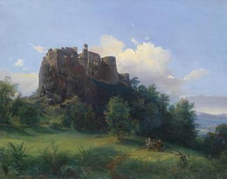 Keywords: Josef Holzer Schloss Paulenstein.jpg Seine Exzellenz Leopold Graf Palffy am Schimmel mit seinem Forstmeister Prokop unter der Ruine von Schloss Paulenstein reitend undeutlich signature/date auf altem Etikett oil on canvas 54 5 x 69 cm 106-388/1 http //www dorotheum com Dorotheum 1844 creator Joseph Holzer PD-old-70-1923 Images from Dorotheum Josef Holzer 1844 paintings Pálffy family Pajštún