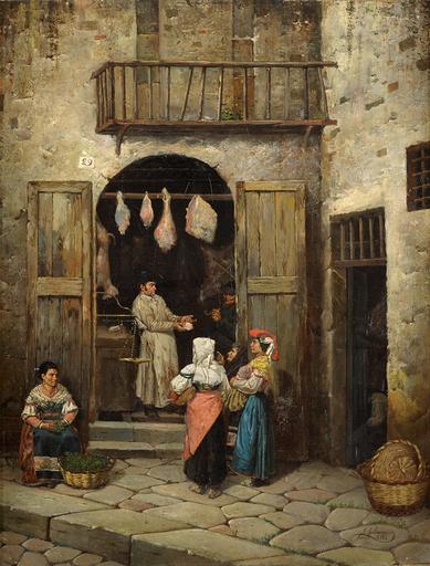 | Keywords: Josep Juliana Albert La Macelleria 1874.jpg oil canvas cm 65 52 Roma 1874 signature / place / date object history credit line accession number http //www duesseldorfer-auktionshaus de/ Düsseldorfer Auktionshaus PD-Art PD-old José Juliana y Albert Butchers in art 1874 paintings Paintings of Rome Rome in the 1870s Shopping in art Butcher's shops Paintings with signatures lower right Paintings with years of production artist Images from Düsseldorfer Auktionshaus Paintings of courtyards and patios |