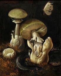 | Keywords: Joseph Hauber (attr) Falter Pilz Schlange.jpg Unsterblichkeit - Falter Knollenblätterpilz und Schlange Öl auf Karton 20 5 x 17 cm http //www allgaeuer-auktionshaus de/ attributed to Joseph Hauber 1766 “1834 PD-art-100 Joseph Hauber Snakes in art Butterflies in art Amanita phalloides Mushrooms in art |