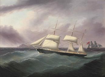 | Keywords: Joseph Heard - The barque Humphrey Nelson.jpg Artwork Joseph Heard 1799-1859 en The barque Humphrey Nelson flying her recognition flags as she passes a three-masted merchantman off a mid-ocean The wooden barque Humphrey Nelson was built at Dundee in 1855 for Nelson Co of Maryport Registered at 476 tons and measuring 134 feet in length with a 25 foot beam she began her career sailing out of Liverpool under the command of her owner Captain P Nelson Within ten years however she was trading out of London to China under Captain Chellew but disappears from record in the early 1870s 1857 oil canvas cm 63 5 83 8 object history credit line Jo Heard 1857 ~ lower left signature and date accession number 1 http //www arcadja com/auctions/en/heard_joseph/artist/12999/ Christie's London May 13 2009 lot 803 via ARCADJA auction results<br/>2 Christie's online 5688791 8918 113 London Jun 12 2013 PD-old-auto-1923 1859 Joseph Heard Humphrey Nelson ship 1855 19th-century sailing ships in paintings 19th-century paintings location missing Paintings with signatures lower left Paintings with years of production artist 1857 paintings |