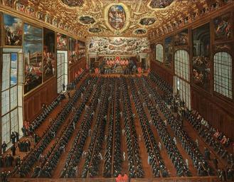 | Keywords: Joseph Heintz dJ Sala Maggior Consiglio Venezia.jpg The interior of the Sala Maggior Consiglio The Doge's Palace Venice with patricians voting on a bulletin for the election of new magistrates Oil on canvas 120 x 150 cm http //www bonhams com/ Bonhams by 1678 Joseph Heintz der Jüngere 1600-1678 PD-old-100 Images from Bonhams Joseph Heintz II Paintings of the Doge's Palace Venice Parliaments Interior of the Doge's Palace Venice - Sala del Maggior Consiglio | ||||
