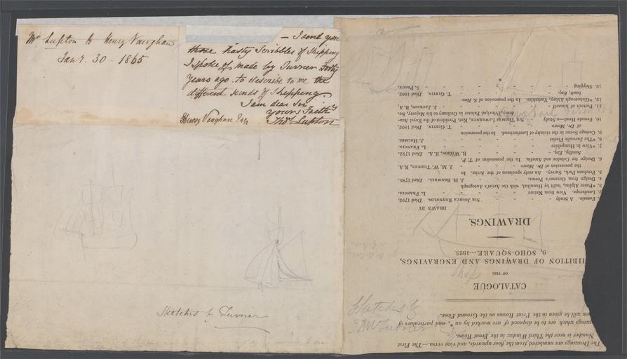 | Keywords: Joseph Mallord William Turner - Sketch of Two Ships on a Catalogue Page - Google Art Project.jpg ~ 1823 London 1775 Chelsea 1851 Joseph male 2322909 Mallord William Turner British 1775 - 1851 /collection/yale-center-for-british-art/artwork/sketch-of-two-ships-on-a-catalogue-page-joseph-mallord-william-turner/2299728/ Joseph Mallord William Turner Artist /artist/j-m-w-joseph-mallord-william-turner/4127042/ 4127042 /collection/yale-center-for-british-art/ Yale Center for British Art 2305845 http //britishart yale edu/ 2/23/2012 10 27 39 PM /collection/yale-center-for-british-art/artwork/sketch-of-two-ships-on-a-catalogue-page-joseph-mallord-william-turner/2299728/ 1818 ca 1823 shipping ships sketch marine art catalogues Graphite on medium slightly textured cream wove paper adhered to medium slightly textured cream laid paper 225 2299728 False 1828 3/24/2012 11 07 37 AM YCBA/lido-TMS-5467 http //collections britishart yale edu/vufind/Record/1669732 Yale Center for British Art Paul Mellon Collection drawing 1810 1830 Chelsea Creation w422 x h225 cm ca 1823 False 1 74744027303754 Item sketch-of-two-ships-on-a-catalogue-page-joseph-mallord-william-turner Sketch of Two Ships on a Catalogue Page s 422 Inscribed in pen and brown ink upper left Mr Lupton to Henry Vaughan Janr 30 - 1865 - I send you these hasty scribbles of shipping I spoke of made by Turner forty years ago to describe to me the different kinds of shipping I am dear Sir yours Faith y Thos Lupton Henry Vaughan Esqr ; inscribed in graphite upper right are Turner ; in graphite lower center W B Cooke or G Cooke ; in graphite lower right Ship ; in pen and brown ink lower center Sketches by Turner ; in graphite lower left < > < > < > < > ; in graphite lower right Sketches by JMW Turner Esqr ; inscribed in graphite verso upper left Take care of this Inscription _Signed_and_Dated Not signed not dated Not on View Graphite on medium slightly textured cream wove paper adhered to medium slightly textured cream laid paper shipping ships sketch marine art catalogues special url_id oQFcsZm_s7CCEw PD-old-100-1923 1851 Google Art Project works by Joseph Mallord William Turner Drawings by Joseph Mallord William Turner |