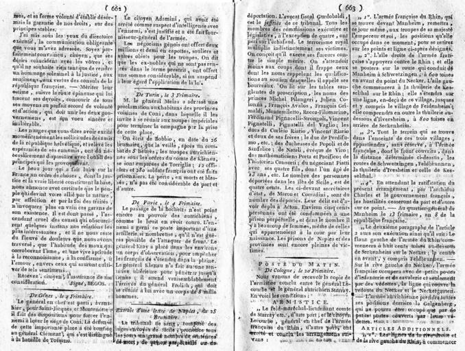 | Keywords: Journal de Bruxelles nr 83 1799 (662 663).jpg French Republican Calendar French republican date is Tridi 23 Frimaire VIII Saturday 14 December 1799 This journal contains many dispatches with news all over Europe Journal de Bruxelles 1799 J L Deboubers 1799-12-14 File Journal de Bruxelles nr 83 1799 660 661 jpg File Journal de Bruxelles nr 83 1799 664 jpg News Bern 28-11-1799 Genoa 25-11-1799 Turin 24-11-1799 Pavia 25-11-1799 Naples Cologne 11-12-1799 ceasefire PD-old-100 Journal de Bruxelles nr 83 History of Genoa History of Turin History of Pavia Cologne in the 18th century |