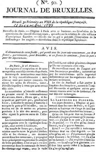 | Keywords: Journal de Bruxelles nr 90 1799 (713).jpg en Nr 90 of the Journal de Bruxelles during the French revolutionary republic occupation of Brussels in 1799 The French republican date is Décadi 30 Frimaire VIII Saturday 21 December 1799 This journal contains many dispatches with news all over Europe Page 713 1799-12-21 Journal de Bruxelles 1799 J L Deboubers File Journal de Bruxelles nr 90 1799 714 715 jpg custom PD-old-100-1923 Uploaded with UploadWizard Journal de Bruxelles nr 90 | ||||