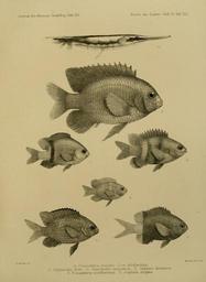 | Keywords: JournalMuseumGodoeffroyHeftXVFischederSudseeHeft7Taf125.jpg en As file A Pomacentrus scolopsis Stegastes nigricans B Pomacentrus scolopsis var albofasciata C Glyphidodon dickii Plectroglyphidodon dickii D Glyphidodon lacrymatus Plectroglyphidodon lacrymatus E Heliastes dimidiatus Chromis dimidiata F Pomacentrus semifasciatus Parma microlepis G Amphisile strigata Aeoliscus strigatus http //www biodiversitylibrary org/ of plate unknown Journal Museum Godeffroy Fisches der Sudsee 1886 PD-old Fische der Südsee Journal Museum Godeffroy Pomacentridae Stegastes nigricans Plectroglyphidodon dickii Plectroglyphidodon lacrymatus Chromis dimidiata Parma microlepis Aeoliscus strigatus |
