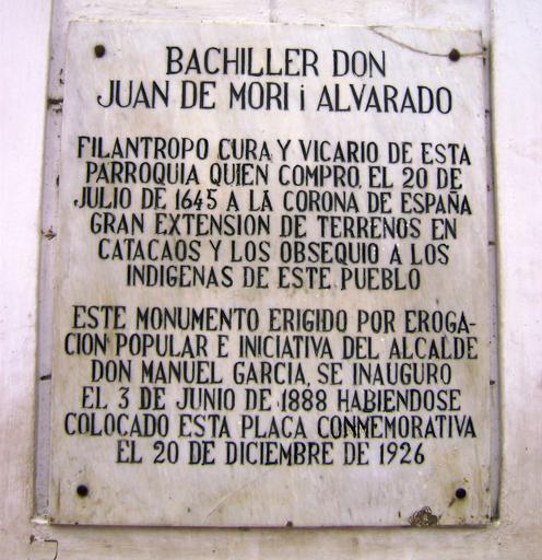 Keywords: Juan de Mori y Alvarado (Plaque on the podium).JPG 5 15 55 7 S 80 40 33 9 W en Plaque on the podium of the statue of Juan de Mori y Alvarado Catacaos Piura Peru es Placa en el podio de la estatuda de Juan de Mori y Alvarado Catacaos Piura Perú Text <div><center> BACHILLER DON<br> JUAN DE MORI i ALVARADO<br> FILANTROPO CURA Y VICARIO DE ESTA<br> PARROQUIA QUIEN COMPRO EL 20 DE<br> JULIO DE 1645 A LA CORONA DE ESPAÑA<br> GRAN EXTENSIÓN DE TERRENOS EN<br> CATACAOS Y LOS OBSEQUIO A LOS<br> INDIGENAS DE ESTE PUEBLO<br> ESTE MONUMENTO ERIGIDO POR EROGA-<br> CION POPULAR E INICIATIVA DEL ALCALDE<br> DON MANUEL GARCIA SE INAUGURO<br> EL 3 DE JUNIO DE 1888 HABIENDOSE<br> COLOCADO ESTA PLACA CONMEMORATIVA<br> EL 20 DE DICIEMBRE DE 1926<br> </div></center> own Dtarazona Plaques in Piura Catacaos |