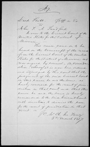 | Keywords: Judgment in the U.S. Supreme Court Case Dred Scott v. John F. A. Sandford - NARA - 301674.jpg Scope and content Chief Justice Roger B Taney read the majority opinion of the Court which stated that black people were not citizens of the United States and therefore could not expect any protection from the federal government or the courts; the opinion also stated that Congress had no authority to ban slavery from a federal territory The decision was overturned by the 13th and 14th amendments to the Constitution which abolish slavery and declare all persons born in the United States to be citizens General notes Exhibit History American Originals December 1996 - June 1997 National Archives Washington DC Exhibit No 624 0119 The Rights of All April 1987 - July 1987 Schomburg Center New York NY Exhibit No 1040 0005 301674 Local identifier Supreme Court of the United States 02/02/1790 - Archives I Reference Section Textual Archives Services Division NWCT1R National Archives Building 7th and Pennsylvania Avenue NW Washington DC 20408 1857-03-06 Record group Record Group 267 Records of the Supreme Court of the United States 1772 - 2007 Record group ARC 594 Appellate Jurisdiction Case Files compiled 1792 - 2006 Series ARC 301668 File unit Dred Scott Plaintiff in Error v John F A Sandford 1846 - 1857 File unit ARC 561075 Variant control numbers NAIL Control Number NWCTB-267-PI139E21-3230 JUDGMENT <br /> NAIL Control Number NWDT1-267-PI139E21-3230 JUDGMENT Other versions <gallery> File Judgment_in_the_U S _Supreme_Court_Case_Dred_Scott_v _John_F _A _Sandford_-_NARA_-_301674 tif tif File Judgment_in_the_U S _Supreme_Court_Case_Dred_Scott_v _John_F _A _Sandford_-_NARA_-_301674 jpg jpg </gallery> NARA-cooperation PD-USGov Dred Scott 1857 Supreme Court of the United States cases |