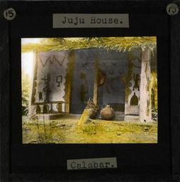 | Keywords: Juju House (imp-cswc-GB-237-CSWC47-LS2-015).jpg en <br> Juju House Image of the entrance to a Juju House in Calabar There are two round clay pots outside the door and the walls of the house are decorated with tribal art ; Juju is a word of West African origin that refers to the supernatural powers ascribed to an object and also to the use of such objects Juju houses in Calabar were built to house a dead man's spirit It was outside a juju house that Mary Slessor delivered her first public message Photographer Unknown Filename imp-cswc-GB-237-CSWC47-LS2-015 tif Coverage date circa 1880 Part of collection International Mission Photography Archive ca 1860-ca 1960 Type images Part of subcollection Photographs from the Centre for the Study of World Christianity University of Edinburgh U K ca 1900-ca 1940s Repository name Centre for the Study of World Christianity Archival file impaunpub_Volume7/1289 url Repository address The University of Edinburgh School of Divinity New College Mound Place Edinburgh EH1 2LX United Kingdom Geographic subject country Nigeria Format aacr2 1 lantern slide 8 x 8 cm Geographic subject continent Africa Rights Contact the repository for details Part of series Mary Slessor LS2 Repository email divinity-CSWC ed ac uk Subject lcsh Keyword Supernatural; Spirits; Tribal art Date created circa 1880 Publisher of the digital version University of Southern California Libraries Subject aat genre exterior views Format aat lantern slides Legacy record ID impa-m68159 Access conditions http //www ed ac uk/schools-departments/divinity/research/centres/world-christianity/collections-resources File GB 237 CSWC47/LS2/15 1880 author http //digitallibrary usc edu/cdm/ref/collection/p15799coll123/id/64412 PD-old-70-1923 Magic lantern images Images from USC Digital Library uploaded by Fæ International Mission Photography Archive ca 1860-ca 1960 Calabar |