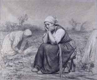 | Keywords: Jules Adolphe Aimé Louis Breton - Repose - Walters 37902.jpg This drawing dates from perhaps the most formally successful decade of Breton's career The artist represents a young woman lost in dreamy contemplation as she pauses for rest during the harvest Her fellow harvesters continue to work behind her and there are haystacks visible in the distance The contrast is notable between the highly finished manner of the resting woman and the far sketchier treatment of the landscape background and secondary figures The resting woman is characteristic of Breton's classicizing treatment of form in the 1860s but it may also reflect an awareness of more recent sources 1867 charcoal and white chalk on blue thick heavily textured cartridge-style laid paper; the blue color comes from blue and red textile fibers in a white furnish cm 47 6 57 5 accession number 37 902 20842 William T Walters Baltimore before 1879 mode of acquisition unknown Henry Walters city Baltimore Walters Art Museum Henry Walters Acquired by William T Walters before 1879 Jules Breton/1867 in charcoal lower right; 823 on reverse of frame upper right; Walters 209 on label attached to reverse of frame upper left; watermarked MFDT in block letters The Essence of Line Jules Breton and the French Rural Tradition The Dixon Gallery and Gardens Memphis; The Sterling and Francine Clark Art Institute Williamstown; Joslyn Art Museum Omaha 1982-1983 place of origin France Walters Art Museum license 2D The Essence of Line Paintings by Jules Breton Temporary for Cat-a-lot - Female humans Black and white photographs of hand gestures Hands on head People resting Sitting with hand on head Kerchiefs in art Drawings in the Walters Art Museum 1867 drawings Contemplation |