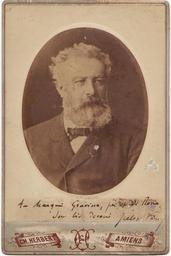 | Keywords: Jules Verne, Gravina portrait c.1883.jpg en Autographed carte cabinet portrait of Jules Verne inscribed by him to the Prefect of Rome Marquis Gravina According to the auctioneer the portrait probably dates from 1883 when Verne was invited to Italy for the 400th anniversary of Raphael's birth The inscription reads Au Marquis Gravina préfet de Rome Son bien dévoué Jules Verne 1883 http //www abebooks com/servlet/BookDetailsPL bi 7895618082 Subject inscription writer portrait owner creator Jules Verne <br>Photographer Charles Herbert 61 Rue de la République Amiens PD-Art PD-old-auto-1923 1905 France 1883 Uploaded with UploadWizard Portraits of Jules Verne |