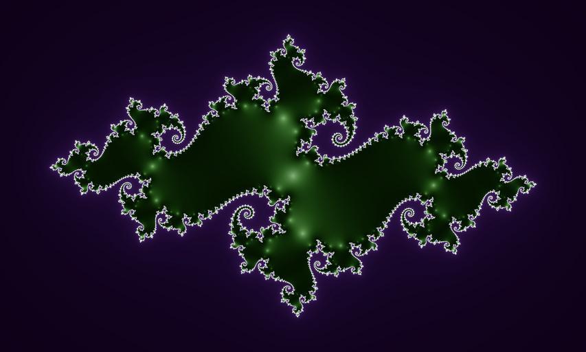 Keywords: Julia-set z2+c -0.742 0.1 5000.jpg Julia set for <math>z\mapsto z 2 -0 742 + 0 1i</math> Own 2008-04-02 Georg-Johann Lay Coloring For definition of <math>E_n \ \ \sigma_n \Sigma_n z h_a x w_a x </math> see Visualising Julia sets and the helper functions <math>\begin align n 5000\\ K E_n + 2 2\sigma_n\\ J \ln \delta+\Sigma_n z - K \\ V_1 \begin cases h_ 0 6 J \text if z\notin A \infty \text or J > 0\\ h_ 0 09 J \text else \end cases \\ V_2 1- 1-V_1 2\\ V_3 0 7 1-w_ 7 5 \Sigma_n z \\ V \begin cases 1- 1-V_2 1-V_3 \text if z\notin A \infty \\ V_2 \text else \end cases \\ H \begin cases 0 3 \text if z\notin A \infty \\ 0 75 \text else \end cases \\ \mathrm color \operatorname HSV H 1-V V \end align </math> <math>V_1</math> is sufficient to show the Julia set <math>V_2</math> stresses the bright parts <math>V_3</math> serves to shade the Fatou set green and is merged with <math>V_2</math> to <math>V</math> the brightness The hue <math>H</math> is set according to the basin of attraction There are two basins for this one belonging to the attractor ˆž <source lang c> int basin getBasin z ; K EX+2 3 sigma; X log ss - K; if basin 0 X > 0 v hfunc X 6 ; else v hfunc X 09 ; v 1-pow 1-v 2 ; double x; if abstand2 o _0 < 10 x bfunc 15 ss ; x 0 7 1-x ; v 1- 1-v 1-x ; return hsv2rgb 0 3 1-v v ; else return hsv2rgb 0 75 1-v v ; iv - 1+JCOLORS v; color index iv; return color; </source> Connected Julia sets Complex quadratic map Images with C source code |