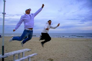 Keywords: jump teamwork sandy beach sea boys holidays seaside